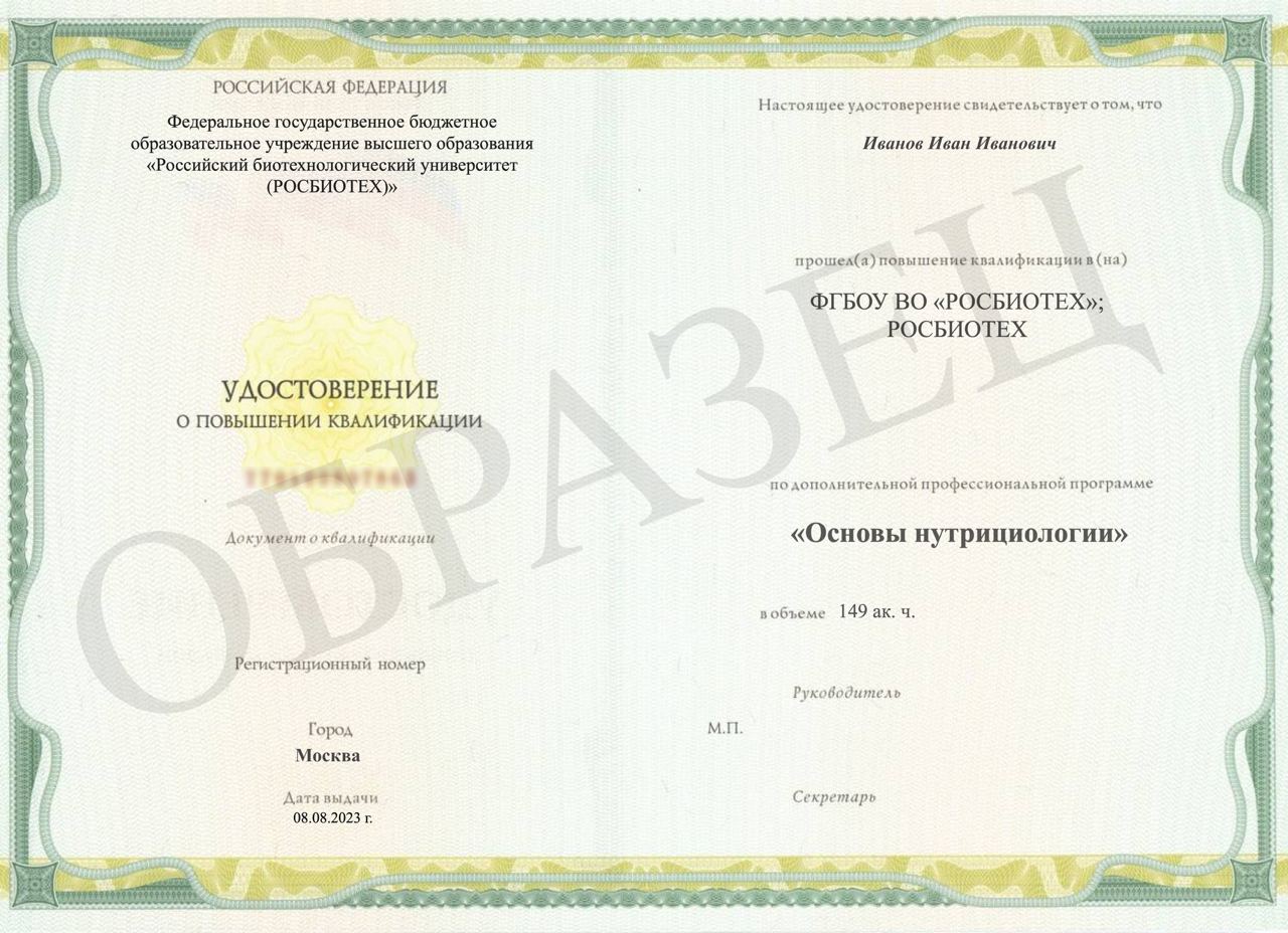 На тарифе PRO вы получаете удостоверение о повышении квалификации на 149 академических часов от Российского биотехнологического университета (ФГБОУ ВО «РОСБИОТЕХ») по курсу "Основы нутрициологии"